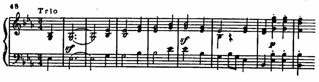 В средней части марша фугато — действенное и динамичное, с исключительной по своему драматизму кульминацией — подобно сонатной разработке.
