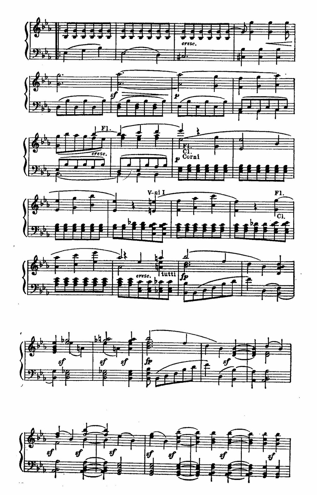Первая из четырех частей симфонии — самая значительная и интересная по содержащимся в ней музыкальным мыслям, способам развития, новизне строения симфонического сонатного allegro. Ни в предшествующих сонатах, ни в последующих симфониях, за исключением, может быть, Девятой не встречается такого изобилия драматически контрастных тем, такой интенсивности развития. Стимул развития, пронизывающего все разделы Allegro, заложен в главной партии, которая является воплощением героического начала симфонии.