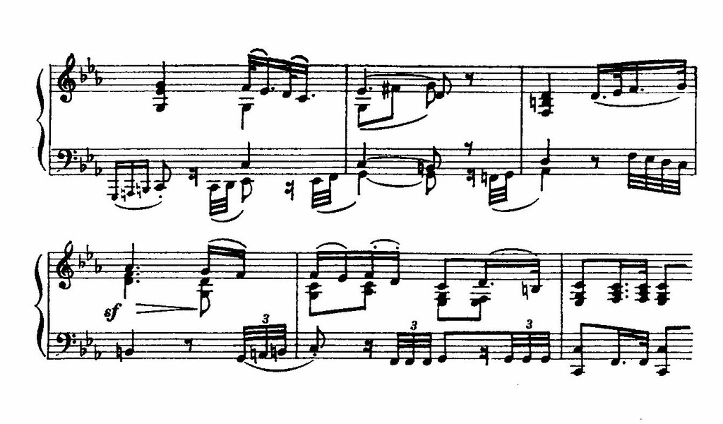 Гениальная простота главной темы создает впечатление, будто она сразу возникла в сознании композитора. А между тем Бетховен нашел ее после долгих исканий, постепенно отсекая от первого варианта все лишнее, общее, тривиальное. В предельно лаконичной форме эта тема воплотила в себе многие характерные для своего времени интонации возвышенно трагического плана (Ср. с темами c-moll’ного квинтета Моцарта, медленной части Es-Dur’ной («Лондонской») симфонии Гайдна, c-moll’ного фортепианного концерта самого Бетховена, его «Патетической сонаты», не говоря уже об «Орфее» Глюка.). Ее близость к интонациям речи сочетается с великолепной мелодической законченностью. Скупая сдержанность и суровость, наряду с неуклонным внутренним движением, придает ей огромную выразительную силу: