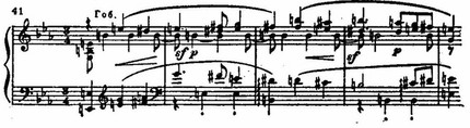 Эффектный аккордовый «бросок» в Des-dur после длительного таяния (на тонических звуках Es-dur), быстро «откатывающийся» в C-dur, образует барьер, отделяющий репризу от коды. Знакомый, заимствованный из «воинственного эпизода» ритмический оборот (см. пример 39), легко несущийся, как бы порхающий, становится фоном основной темы. Его былая воинственность и динамичность переключаются в сферу танца и активного жизнерадостного движения, в которую вовлекается и основная героическая тема:
