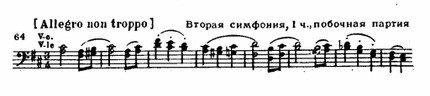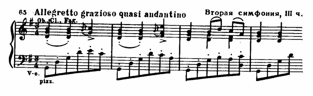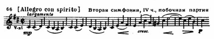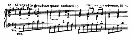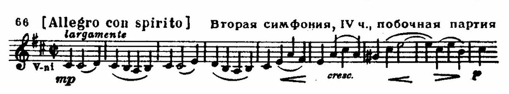 По своей структуре эта симфония примыкает к гайдно-бетховенской традиции. Пасторальным складом отмечено начало первой части; далее, наряду с прекрасными лирическими эпизодами (см. пример 64), возникают энергичные, мужественные образы; порой раздаются и бурные возгласы протеста, но светлый колорит преобладает. Задумчива, возвышенна музыка второй части. Словно зовы природы слышатся в мелодии валторн (позже у деревянных духовых инструментов). Средний эпизод части имеет более изысканный характер; главенствует же в ней сосредоточенное состояние раздумья. В очаровательном лендлере третьей части элегичность сочетается с прихотливой скерцозностью (см. пример 65). И, наконец, в финале воссозданы пестрые картины веселого народного торжества, где чувства нерушимого оптимизма ярко запечатлены в теме побочной партии (это ощущение, в частности, создается настойчивым опеванием мажорной III ступени):