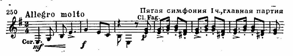 Но вот начинается Allegro — решительно и броско звучит «сквозная» тема. Ею открывается главная партия, которая содержит два контрастных образа: фанфарному призыву валторн (это и есть лейтмотив симфонии) ответствует народно-танцевальная фраза .кларнетов и фаготов: