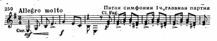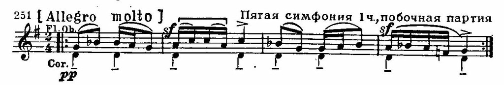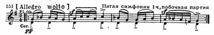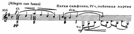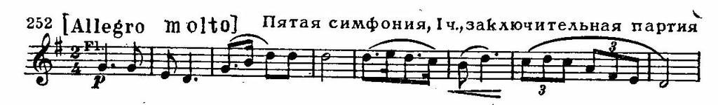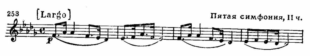 Примечательно также для тонкой мотивной работы Дворжака, что эта тема оказывается родственной заключительной первой части (см. пример 252), что явственно обнаруживается в процессе развития. «Хор» струнных с упоением поет чудесную мелодию (Один из американских учеников Дворжака (В. А. Фишер) обработал этот раздел Largo в виде песни для солиста и хора. Песня приобрела в США такую популярность, что стала даже считаться народной, в результате чего сложилось ошибочное мнение, будто Дворжак воспользовался американской народной мелодией в своем Lagro.).