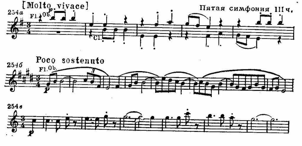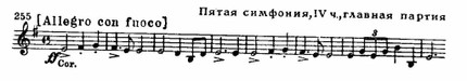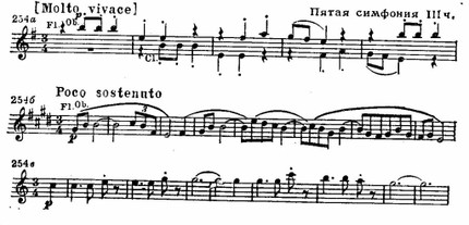 Но неожиданно (перед «трио»), драматизируя содержание части, вторгается резко изломанный, словно искаженный душевной болью «лейтмотив». Образы борьбы возникают и в коде, предвосхищая торжественной фанфарой труб победный итог всей симфонии.