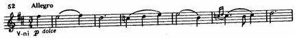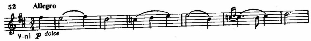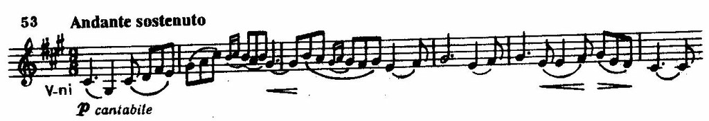 В то же время тема несет на себе печать типично глазуновской краткости дыхания: дальнейшее ее развитие осуществляется за счет перемещения в разные регистры, передачи другим инструментам, общего изменения оркестровой фактуры.