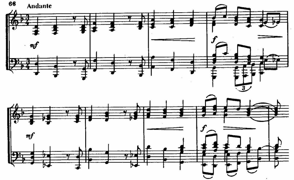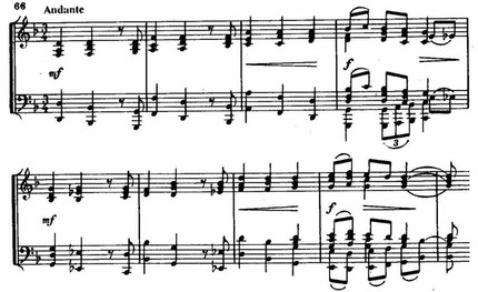 Andante построено на трех темах, изложение которых представляет некоторую аналогию сонатной экспозиции. Первая торжественно-величавая тема, исполняемая медными духовыми с частичной поддержкой деревянных, заключена в рамки законченного восьмитактового построения,