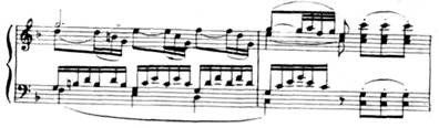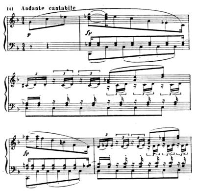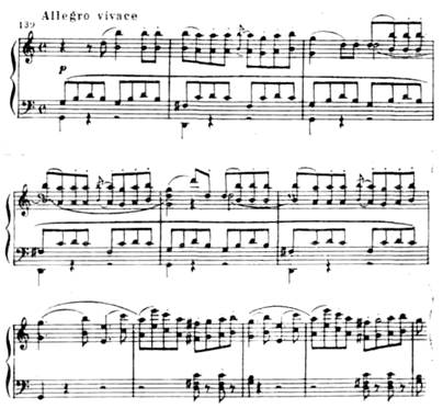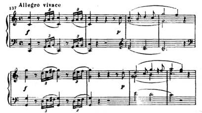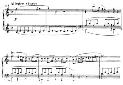 Особенно драматична связующая партия с ее минорным ладом, синкопами, пульсирующими триолями, уменьшенными гармониями:
