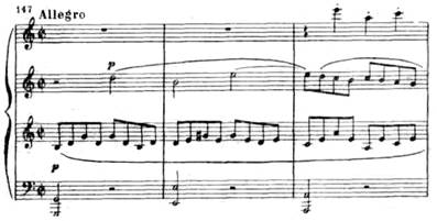 Эта же тема лежит в основе связующей партии, особенно ее второй элемент, получающий секвенционное развитие. В доминантовой тональности (соль мажор) написана побочная партия — легкая, подвижная, как бы парящая: