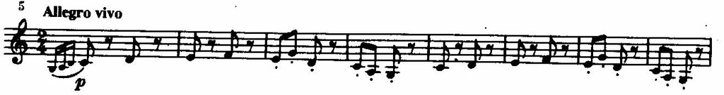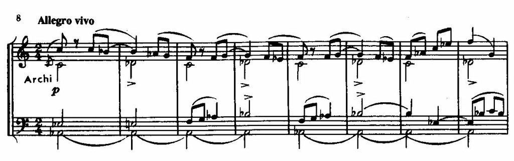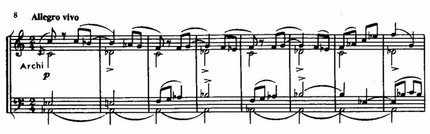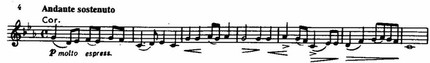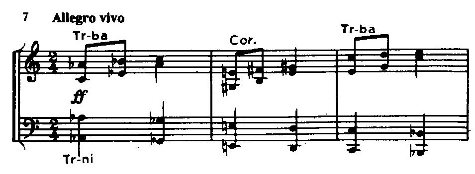 Непосредственно перед переходом к побочной партии в массивном басовом голосе при звучании оркестра tutti ff возникает полный целотонный звукоряд, тогда как начальный отрезок темы в изложении валторн и труб приобретает характер торжественной призывной фанфары.