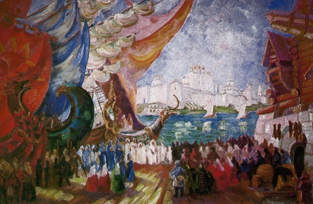 Однако все это было уже и в сцене торжища из «Млады»: толпа, гусляры, жрецы, купцы, торговые гости из далеких стран (и между ними — те же варяг и индиец) и «круговой» принцип организации материала. Новой можно считать «ясную и широкую симфоническую форму» сцены на площади, а равным образом первой картины и финала оперы.