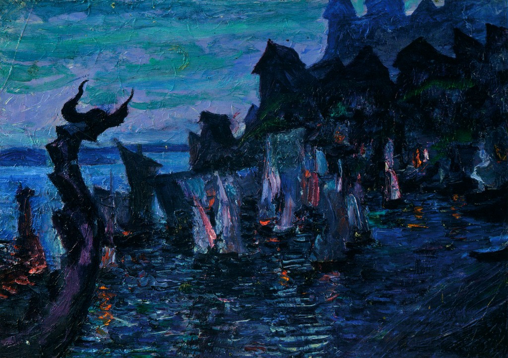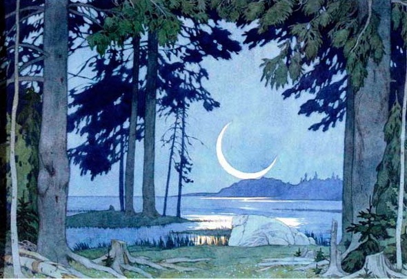 «Берег Ильмень-озера: на берегу бел-горюч камень. Светлая летняя ночь. Рогатый месяц на ущербе. Садко сидит на камне. В руках у него гусли».