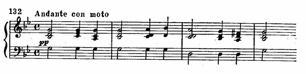 Псалмодическая мелодия, похоронный ритм, хоральный стиль изложения напоминают лаконичную тему из Allegretto Седьмой симфонии Бетховена.