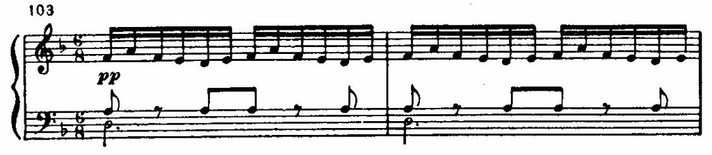 В наступившей тишине слышатся поначалу короткие, прерываемые паузами, фразы фортепиано, а затем восстанавливается прежнее единообразное движение — монотонное гудение веретена: