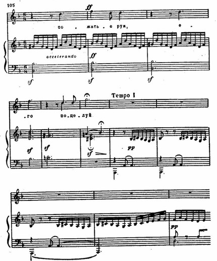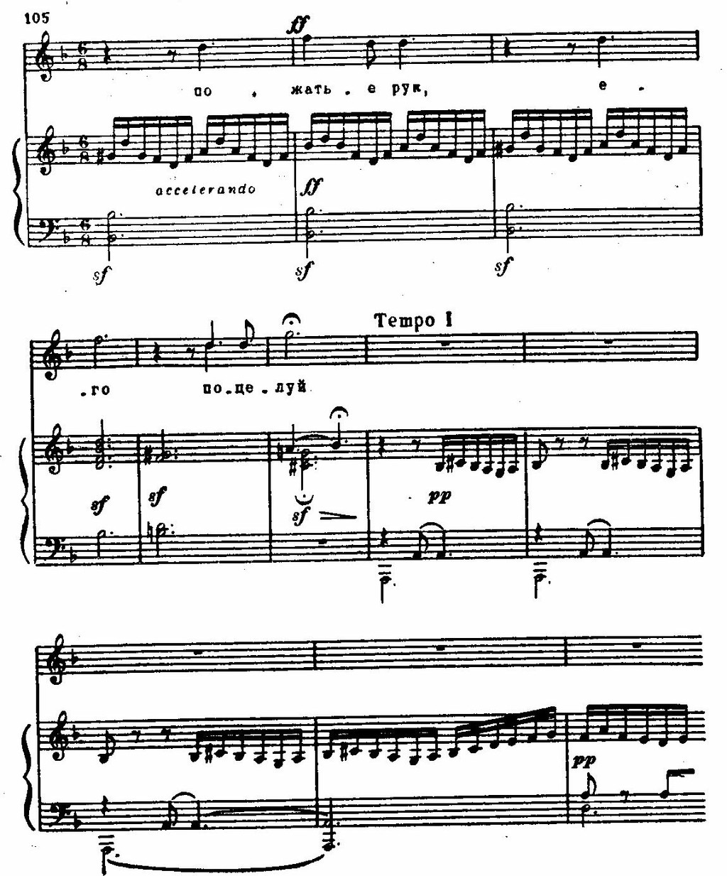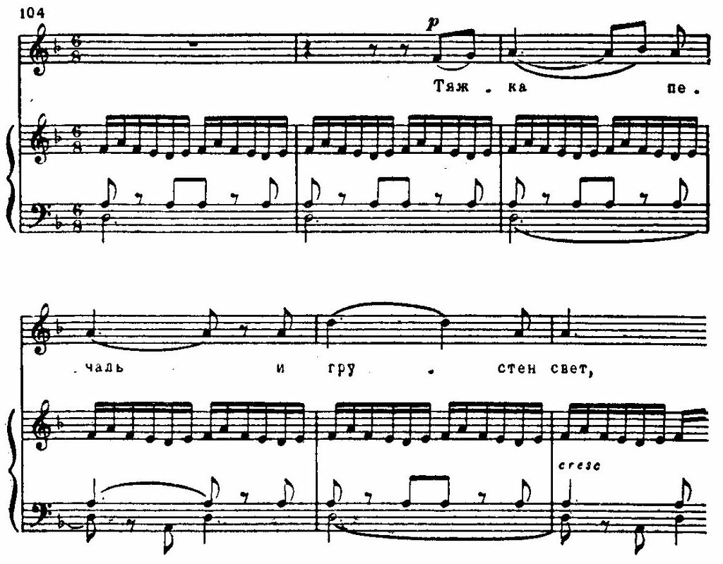 Нарисованные рукой мастера некоторые детали в фортепианной партии помогают проникнуть в глубь психологического состояния, понять и почувствовать переходы от бурного эмоционального подъема к спаду, от мечты — к житейским будням, к естественному в этом случае рефрену: «тяжка печаль и грустен свет».