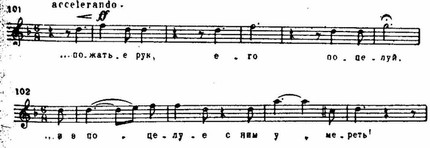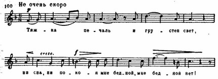 Выразительность мелодии усилена ритмическим строением: сочетание разнообразных длительностей приближает песенные по существу интонации к естественности человеческой речи.