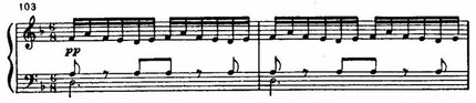В начальном четырехтактном предложении, состоящем из двух звеньев, заключено мелодическое ядро всего произведения. Первый двутакт построен на опевании квинтового звука, окруженного поступенным ходом и замыкающей его горестно никнущей секундовой интонацией: