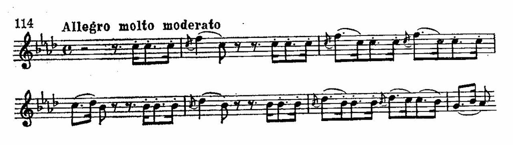 Маршевые темы, подобно вальсовым, часто проникают в сонатно-симфонические произведения Шуберта, придавая им иногда танцевально-бытовой, иногда героический оттенок. Таковы, например, темы из Andante Es-dur’ного трио, из первой части a-moll’ной фортепианной сонаты ор. 42, из побочной партии струнного квинтета, из Andante Девятой симфонии C-dur: