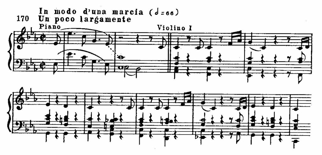 За Allegro следует медленная часть в характере похоронного марша. Главная тема суровой сосредоточенностью интонации и сдержанным звучанием близка Бетховену: