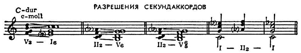 Субдоминантовый секундаккорд, или секундаккорд II ступени, обозначается S2 или II2, разрешается в доминантовый секстаккорд (V6) или доминантовый квинтсекстаккорд (V6/5), a также (в виде вспомогательного аккорда) в тоническое трезвучие. См. Аккорд, Обращение аккорда.