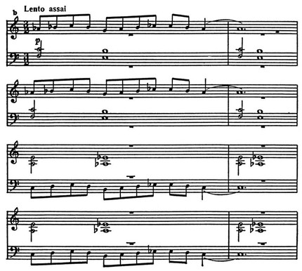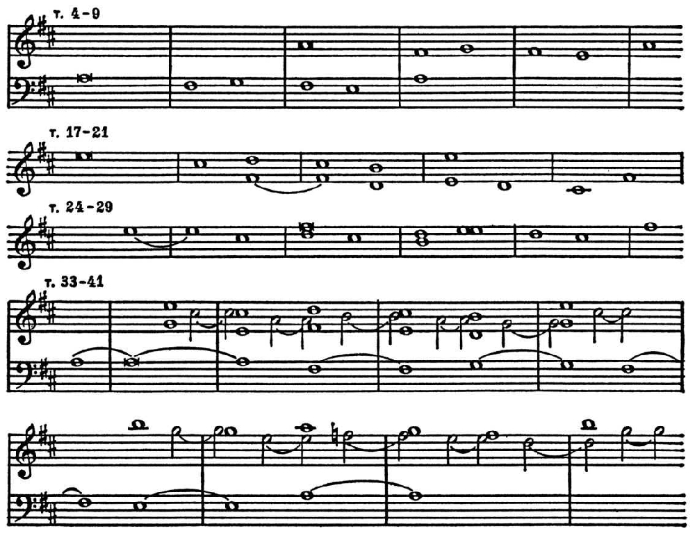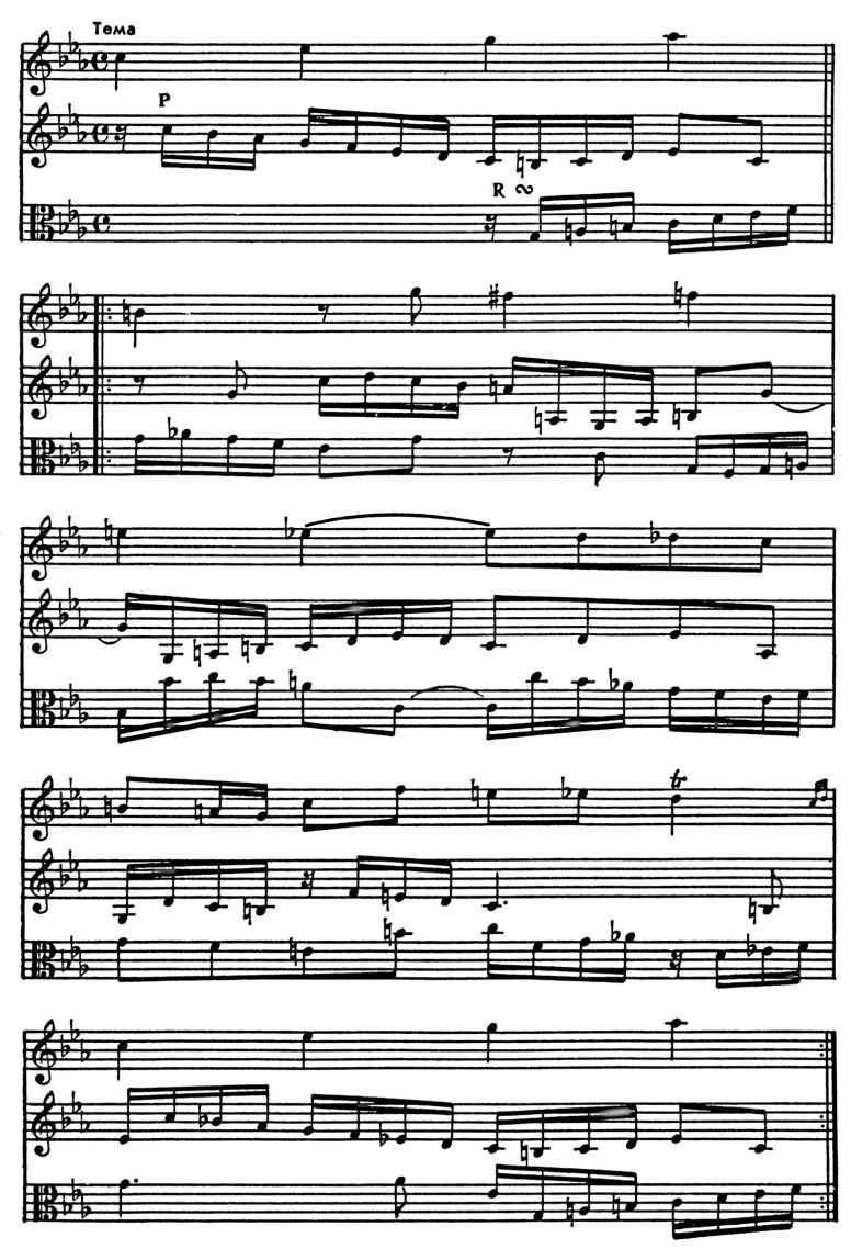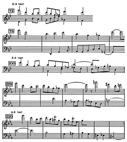производное в виде канона (цифра 78) образуется в результате горизонтального смещения и одновременно проведения верхнего голоса в увеличении; в начале коды (3-й такт после цифры 100) производное во вдвойне-подвижном контрапункте (расстояние вступления 1 такт, нижний голос передвинут на дециму, верхний — на квинтдециму вниз); контрапунктич. варьирование завершается в коде финала, где звучит модулирующая канонич. секвенция (цифра 219), представляющая производное соединение во вдвойне-подвижном контрапункте (расстояние вступления 2 такта, оба голоса — в прямом движении); далее (4-й такт после цифры 220) производное соединение — канон с вертикальным и горизонтальным передвижением и одновременно с четырёхкратным увеличением в басу (в примере опущены сопровождающие и удваивающие голоса):