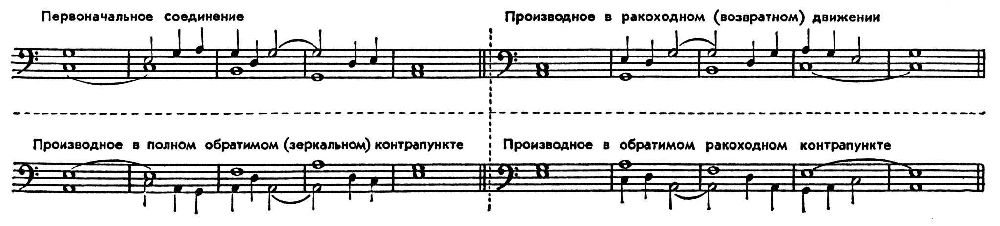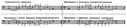 В своих трудах С. И. Танеев не рассматривал ни обратимый (хотя это входило в планы его науч. исследований), ни ракоходный контрапункты (как, по-видимому, не имевший большого практич. значения в то время). Теория полифонии, учитывая особенности совр. композиторской практики, расширяет понятие С. к. и рассматривает как самостоятельные его виды ракоходный контрапункт, а также допускающий в производном соединении увеличение или уменьшение к.-л. из мелодич. голосов первоначального. Напр., в рондообразном финале 3-й симфонии Караева начальный рефрен написан в форме 3-гол. инвенции, где вступающие голоса (ритмически подобные теме) слагаются вместе с противосложениями из звуков додекафонной серии; 2-е проведение рефрена (цифра 4) представляет собой производное соединение в ракоходном контрапункте; во 2-м эпизоде, написанном в форме фуги, репризная стретта (16 тактов до цифры 10) складывается из проведений темы в прямом и ракоходном движениях; в начале репризы 1-й части симфонии (цифра 16) звучит 3-гол. бесконечный канон, где верх. голос — тема-серия в прямом, средний — в ракоходном, нижний — в обращённом ракоходном движениях.