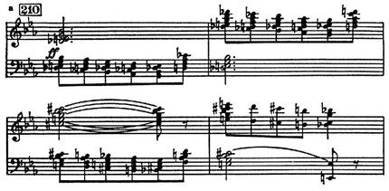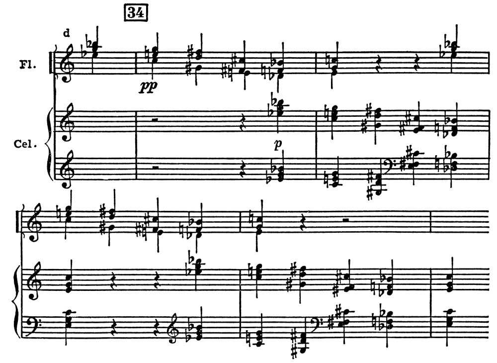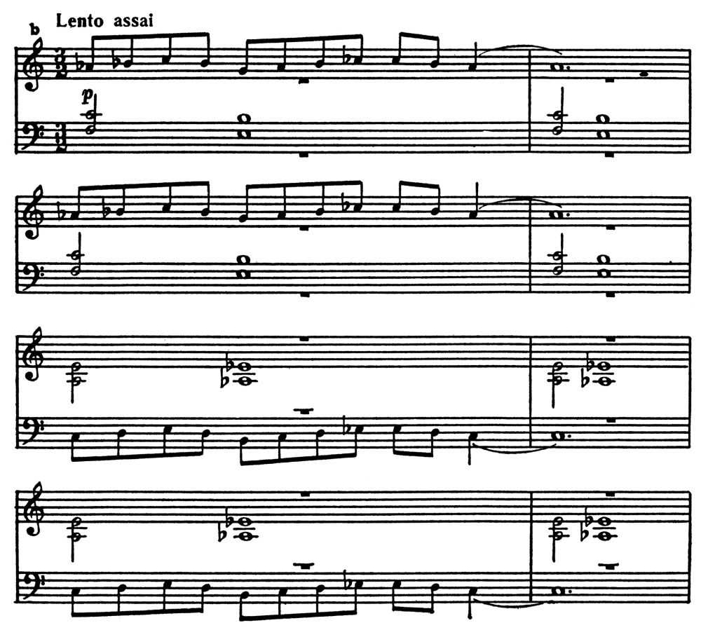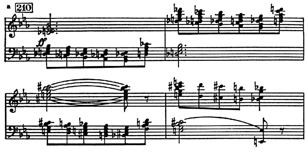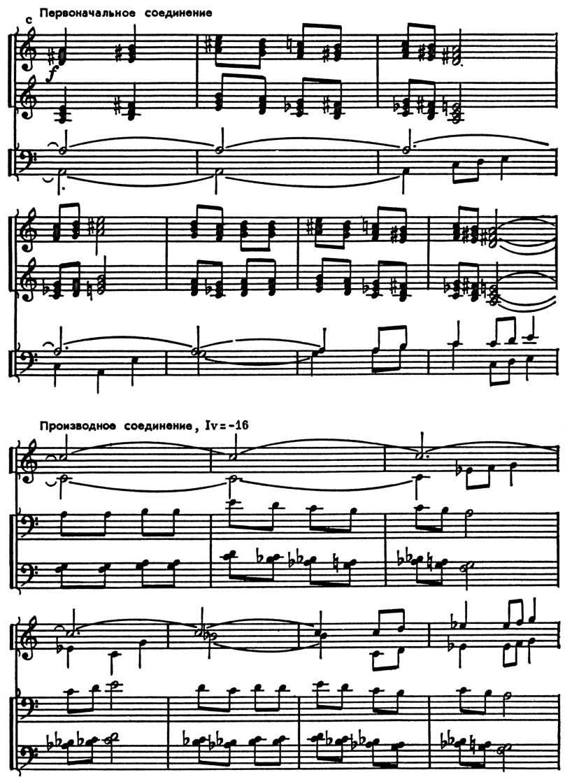 в «Ночи» из «Скифской сюиты» Прокофьева голоса в построении типа бесконечного канона дублируются аккордами разной структуры (см. пример d, кол. 99).