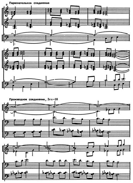За рубежом термин «сложный контрапункт» не применяется; в нем. музыковедческой лит-ре используется родственное ему понятие mehrfacher Kontrapunkt, обозначающее только тройной и четверной вертикально-подвижной контрапункт. В С. к. различаются первоначальное (данное, исходное) соединение мелодич. голосов и одно или несколько производных соединений — полифонич. вариантов первоначального. В зависимости от характера изменений существуют, согласно учению С. И. Танеева, три главных вида С. к.: подвижной контрапункт (подразделяемый на вертикально-подвижной, горизонтально- подвижной и вдвойне-подвижной), обратимый контрапункт (подразделяемый на полный и неполный обратимый) и контрапункт, допускающий удвоения (одна из разновидностей подвижного контрапункта). Все указанные виды С. к. нередко комбинируются; напр., в фуге Credo (No 12) из мессы h-moll И. С. Баха два вступления ответа (в тактах 4 и 6) образуют первоначальное соединение — стретту с расстоянием вступления 2 такта (воспроизведено в тактах 12–17), в тактах 17–21 звучит производное соединение во вдвойне-подвижном контрапункте (расстояние вступления 11/2 такта с вертикальным смещением ниж. голоса первоначального соединения вверх на дуодециму, верхнего — вниз на терцию), в тактах 24–29 образуется производное соединение от соединения в тактах 17–21 в вертикально-подвижном контрапункте (Iv = — 7 — двойной контрапункт октавы; воспроизведено на другой высоте в тактах 29–33), от такта 33 следует стретта в 4 голосах с увеличением темы в басу: верх. пара голосов представляет соединение, производное от первоначальной стретты во вдвойне-подвижном контрапункте (расстояние вступления ¼ такта; воспроизведено на другой высоте в тактах 38–41) с удвоением верх. голоса секстой снизу (в примере опущены полифонич. голоса, не входящие в указанные выше соединения, а также сопровождающий 8-й голос). Нотный пример см. кол. 94.