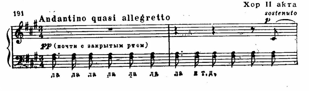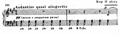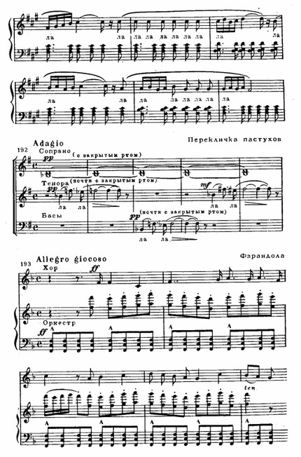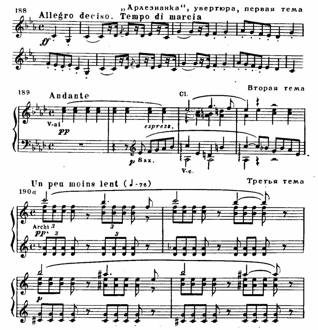 Тремя сферами — радостного упоения жизнью, задушевной интимности и трагического отчаяния — Бизе обрисовывает сущность, зерно драмы. Он вторгается своей музыкой в пьесу, подчеркивая действенные моменты, нарастание конфликтов. Чаще всего, как сказано, это связано с выделением картин народной жизни. Таковы антракт ко II акту («Пастораль») и примыкающий к нему крестьянский хор (см. пример 191); полная поэзии вечерней тиши перекличка пастухов (см. пример 192) — привлекает внимание тонкий колористический эффект: хор поет частично с закрытым, частично с полузакрытым ртом; антракт к III акту, передающий звон колоколов (Carillon), и, наконец, заключительная фарандола, мелодия которой — она также народного происхождения — искусно сочетается с темой «марша королей» (см. пример 193).
