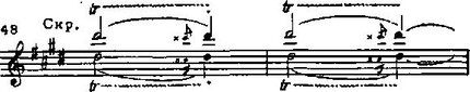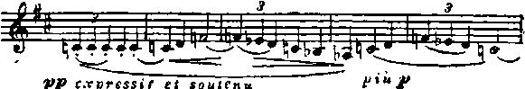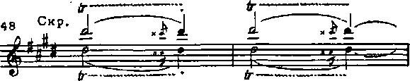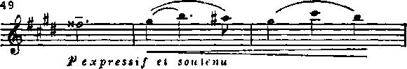Дальше опять сдержанность. Возвращение темы примера 48 дано теперь на трепетно-пульсирующем фоне струнных. Сходство с восточной музыкой русских композиторов (и в частности с «Тамарой» Балакирева) становится еще более ощутимым. Только что промелькнувшему восторгу противопоставлена теперь легковейная грусть изящного танца. И Дебюсси подчеркивает ее, утверждая соль-диез минор и поручая первым скрипкам вздыхающий подголосок.