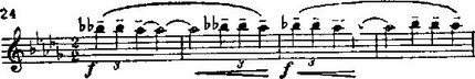 А с возвратом пяти бемолей опять звучит тема примера 24, но теперь уже настойчиво, полно, как бы расцветая.
