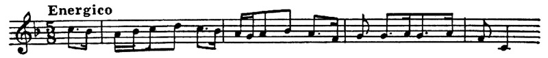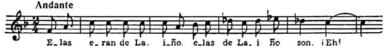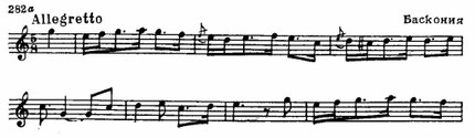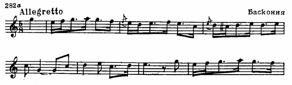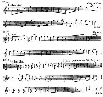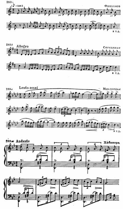 Национальное своеобразие обнаруживается и в складе испанских мелодий, которым свойственно заключение на доминанте. Вообще доминанта является как бы «центром притяжения» интонационного развития. К этому «центру» нередко устремляются два тетрахорда — снизу и сверху, доминантовый тон их объединяет. Нижний тетрахорд обычно мажорный, верхний — минорный, что при большой роли доминанты придает всему ладу фригийский оттенок (см. заключение «Фанданго» Мануэля де Фальн и схему 286 б):