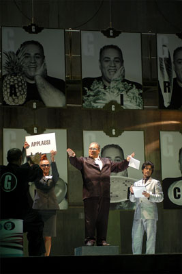 Обе исполнительницы партии Эрнестины – меццо-сопрано, однако голос испанки Сильвии Тро Сантафе имеет глубокую, почти контральтовую насыщенность, а вокальная фактура Марины Пруденской – вполне традиционное меццо. Первая берет своим богатыми певческим данными, вторая – поразительной выучкой и артистической выразительностью. В обсуждаемом комическом фарсе стальное звучание Антонино Сирагузы воспринимается немного искусственным, зато слегка «маслянистый» и в то же время лирически наполненный тенор Дмитрия Корчака в вокальный облик его героя вносит необходимые романтически теплые краски. На другом полюсе этой постановки – пара басов-буффо. Оба раза эту специфически непростую нишу заполняли итальянцы, которым в их родной музыкальной стихии, как говорится, и карты в руки! В 2002 году это были уже маститый Бруно Пратикó (Гамберотто) и только начинавший тогда свою карьеру Лоренцо Регаццо (Бураликкьо). Но в 2008 году уже гораздо в большей степени потрясает другая изумительная пара – Бруно де Симоне (Гамберотто) и Марко Винко (Бураликкьо), особенно Марко Винко, невероятно тонкий и вдумчивый певец-актер. В его профессиональном арсенале есть всё: врожденное чувство музыкальности, изумительная вокальная выучка, завораживающий эмоциональный посыл, владение безупречной стилистической культурой, совершенно неиссякаемый актерский кураж и интригующая ситуационная непредсказуемость на сцене. В партии Розалии выступила Аманда Форсайт, в партии Фронтино – Рикардо Мирабелли. В заключении остается добавить, что постановку 2008 года сопровождали Пражский камерный хор и Orchestra Haydn di Bolzano e Trento, за пультом которого – дирижер Умберто Бенедетти Микеланджели. Это имя с жанром оперы пересекается нечасто и меломанам более известно по работам в области камерного оркестрового музицирования.