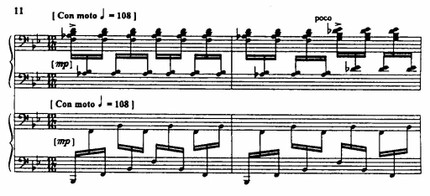 Концерт скреплен прочными тематическими связями. В качестве сквозного развивающегося мотива выступает материал си-бемоль-мажорного токкатного эпизода в разработке первой части (пример 11), проходящего и в других частях цикла (третьей и четвертой). Его роль — драматизирующая, вносящая в общий несколько сдержанный тон повествования беспокойный «нерв». Производная от него ультрахроматика в вариациях граничит с додекафонными построениями, а порой (в четвертой вариации) он преобразуется в набатные звучания, словно давая понять, что замысел концерта связан с тревогами наших дней.