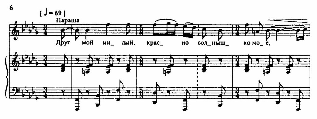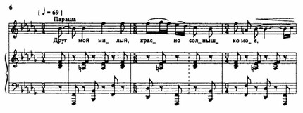 В опере постоянно ощутима дистанция между воспроизводимой интонационной средой и композиторским «я» Стравинского. Один из основных приемов «Мавры» — нарочитое несовпадение гармонических функций мелодии и аккомпанемента, а также функциональное расслоение аккомпанемента — скажем, наложение тоники на доминанту (пример 6), чаще всего в «гитарной» фактуре, в которой выдержана большая часть оперы.