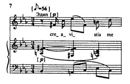 Скорбная, «ламентозная» интонация секунды в сочетании с триольным ритмом — ритмом судьбы! — пронизывает всю партитуру «Эдипа» (тема начального хора проходит несколько раз в первом действии и в конце второго). Этот ритм идет от ритма литавр и связан по смыслу со словом «trivium» — перекресток (на перекрестке Эдип в ссоре убил Лайя, не подозревая, что тот его отец). Ниспадающий, «обреченный» характер мелодики присущ большинству сольных высказываний — и Эдипа, и Тиресия, и Креонта.