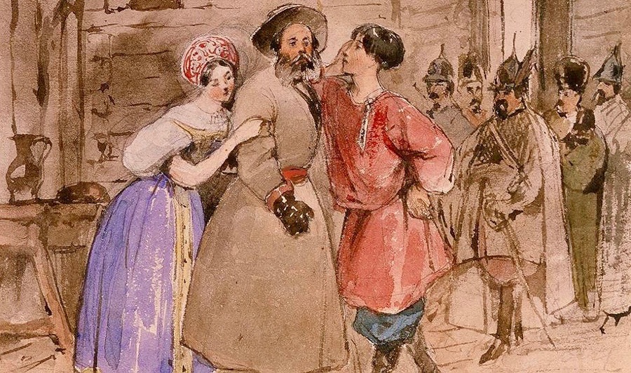 Теперь Собинин сам подходит к Антониде; они о чем-то тихо разговаривают, пока несколько голосов затягивают песню — «песню удалую». «Князь Пожарский молвил слово...» Говорят же Антонида и Собинин, по-видимому, о запрете Сусанина сыграть им свадьбу. И вот Собинин быстрым движением прерывает исполнение песни и прямо задает вопрос Сусанину: «Как? Ужель не бывать моей свадьбе?» Сусанин непреклонен: «Что за веселье в это безвременье!» И тогда Собинин и Антонида очень сердечно упрашивают старика (звучит их терцет «Не томи,родимый»). Сусанин решительно заявляет, что свадьба будет тогда, когда Бог даст Руси царя. Но со слов вернувшегося из Москвы Собинина оказывается, что великий собор уже ставит (выбирает) царя. И кто же он? «Наш боярин» (то есть Михаил Федорович Романов).Коли так, говорит Сусанин, — свадьбе быть. Все ликуют. Сусанин с дочерью и женихом идет к своему двору; народ расходится.