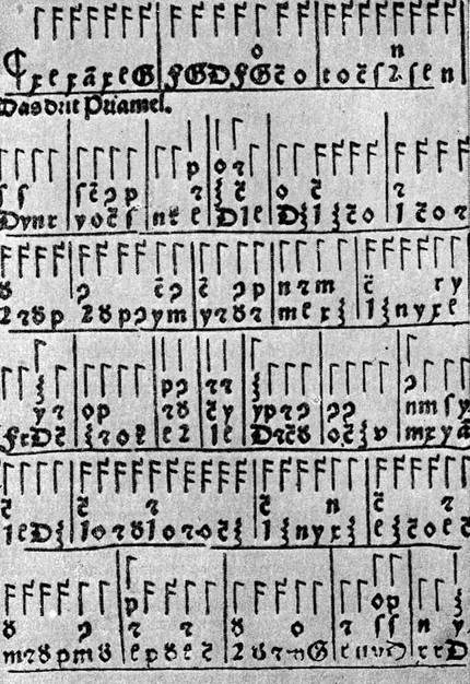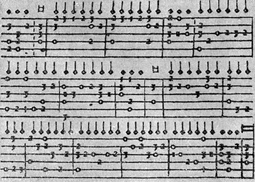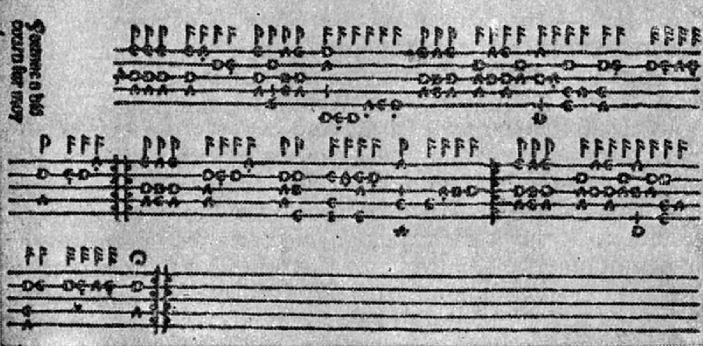 Эта Т. не имела линий, вся запись состояла из букв, цифр, а также штилей с хвостиками, обозначавшими ритм.