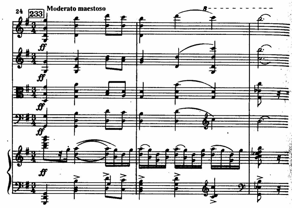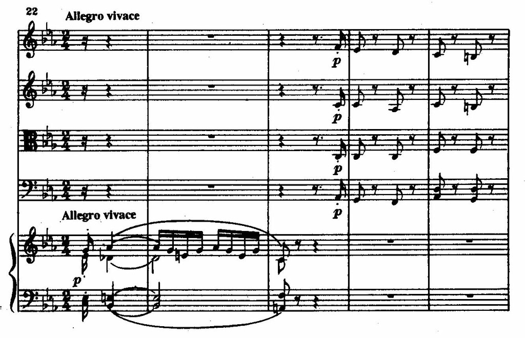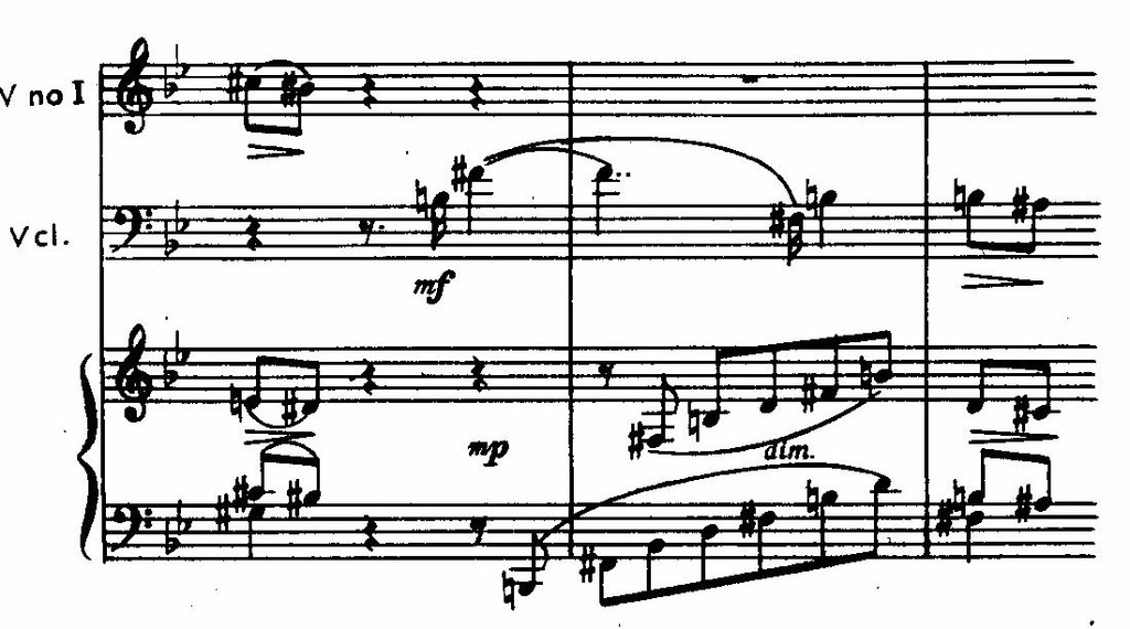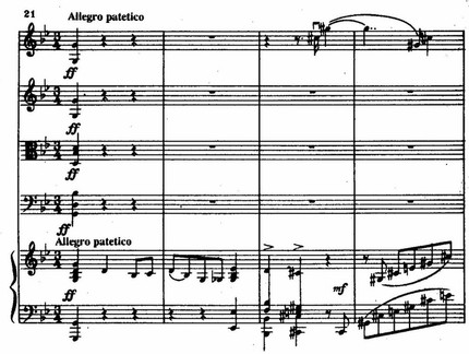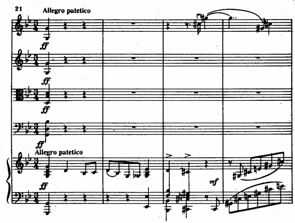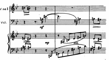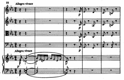 Из этого последнего секундового импульса рождаются и связующая, и побочная партии финала, а двуэлементность в скерцо реализуется как трубный возглас фортепиано (т. 1) и отвечающее ему таинственное piano струнных (т. 2–3).