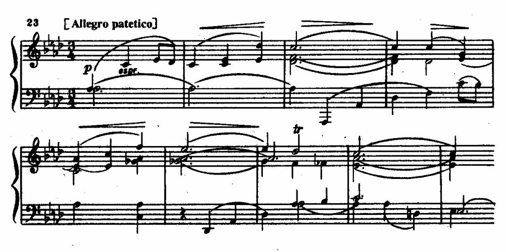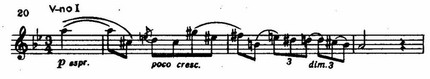 На окончание этой темы, повисающей тревожно-вопросительно, накладывается вступление струнных со второй темой (у первой скрипки, т. 4-10); еще один тематический материал, играющий в дальнейшем немаловажную роль, вскоре появляется у альта. Наконец, звучит взволнованное, проникновенное lamento первой скрипки.