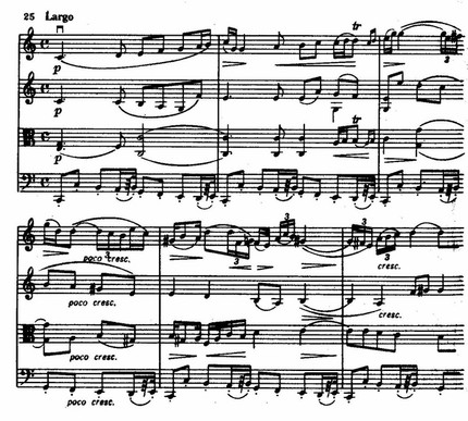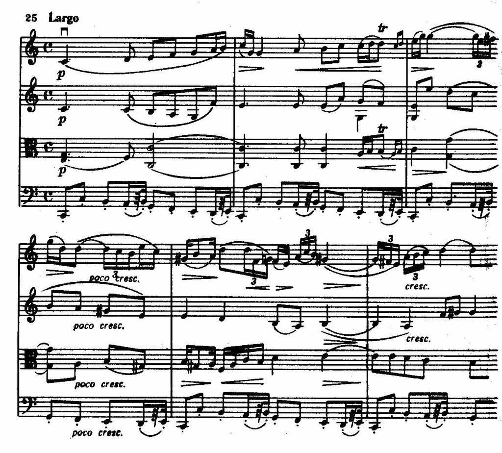 Лирико-философский центр цикла — третья часть, Largo. Свободно, смело, гибко развертывается бесконечная тема первой скрипки, сопровождаемая узором других мелодических голосов на фоне остинатного баса. По слиянности непосредственного чувства и интеллектуальной сосредоточенности эта часть не уступает Adagio из симфонии до минор, а может быть, и превосходит его по целостности.