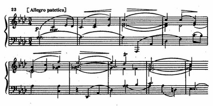 Смысл коды цикла — подведение итогов, вывод из развития состоит в сочетании (средствами контрастной полифонии) приведенной лирической темы и первой темы финала, причем интервал секунды переинтонирован: не малая секунда (ср. с нотным примером 22), тревожная, щемящая, а большая — и с ней мажор, диатоника, утверждение.