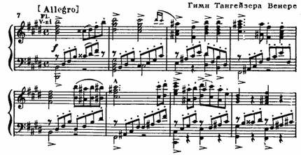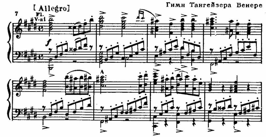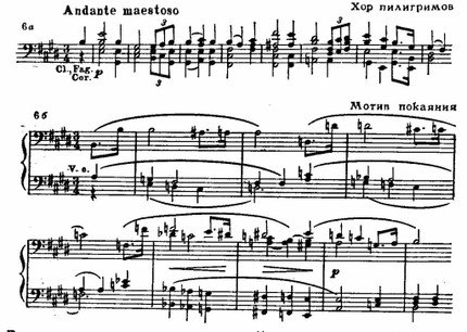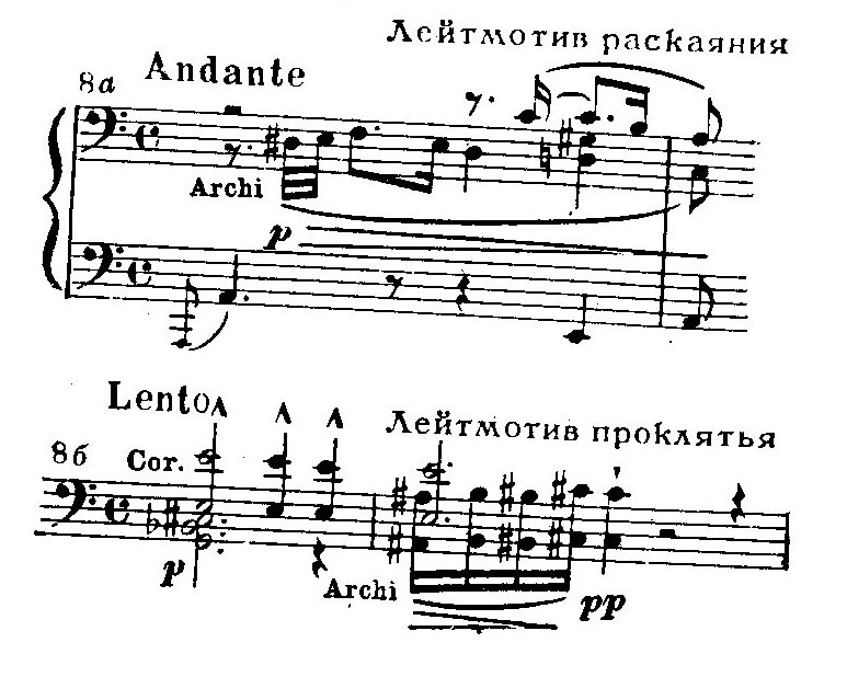 Эти разные музыкально-драматургические сферы объединены в увертюре к опере, этом выдающемся произведении программно-симфонической музыки. Идейный замысел увертюры прекрасно выявлен оригинальной композицией — в сонатной форме с обрамлением. Крайние, «обрамляющие» части призваны обрисовать суровый, непреклонный дух нравственного закона — это хорал пилигримов, строгость звучания которого подчеркнута аккордовым складом и последованием I—VI ступеней (см. пример 6а); такое последование часто используется Вагнером как одно из средств создания эпических образов (ср. вступление к «Лоэнгрину», увертюру к «Мейстерзингерам», шествие рыцарей в «Парсифале» и другие). Вторая, лирическая тема связана с мотивом покаяния, ей свойственны жалобные, хроматически спускающиеся интонации (см. пример 66, ср. пример 8а). В дальнейшем обе темы даются в контрапунктическом изложении (напев пилигримов у тромбонов, в репризе к ним присоединяются трубы; видоизмененная тема раскаяния — у скрипок).