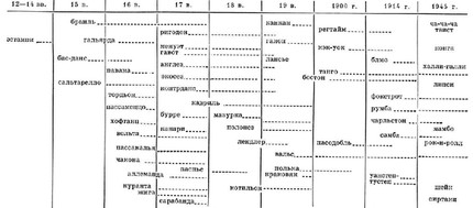 Первые сохранившиеся записи Т. м. относятся к позднему средневековью (13 в.). Они, как правило, одноголосны, хотя среди историков музыки (X. Риман и др.) существует мнение, что в реальном исполнении дошедшие до нас мелодии служили лишь своеобразным cantus firmus, на основе к-рого импровизировались сопровождающие голоса. Ранние записи многогол. Т. м. относятся преим. к 15–16 вв. К ним принадлежали принятые в то время танцы, называемые choreae (лат., от греч. xoreiai — хороводные пляски), saltationes conviviales (лат. — пиршественные, застольные танцы), Gesellschaftstanze (нем. — общественные танцы), ballroom-dances, ballo, baile (англ., итал., испан. — бальные танцы), danses du salon (франц. — салонные танцы). Возникновение и распространение (до сер. 20 в.) наиболее популярных из них в Европе можно представить по след. таблице: