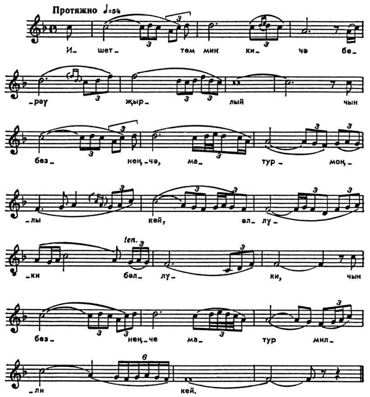 Новые темы и идеи нашли своё воплощение в песенном творчестве С. З. Сайдашева, М. А. Музафарова, Дж. X. Файзи, З. В. Хабибуллина, Ф. З. Яруллина, A. C. Ключарёва. Возникли новые жанровые разновидности песни, сформировались новый тип мелодики, интонац. обороты и нек-рые стилистич. черты нац. музыки, получившие дальнейшее развитие в крупных формах. Интенсивно стало формироваться оперное иск-во. Большой вклад в него внёс Н. Г. Жиганов, создав оперы разных жанров на темы крестьянского и рабочего революц. движения, Великой Отечеств. войны 1941–45, на легендарно-сказочные сюжеты: «Качкын» («Беглец», 1939), «Алтынчач» («Золотоволосая», 1941), «Ильдар» (1942; 2-я ред. под назв. «Дорогой Победы», 1954), «Тюляк» (1945; 2-я ред. «Тюляк и Су-Слу», 1967), «Намус» («Честь», 1945). В операх Жиганова на нац. материале органично претворились муз.-драматургич. принципы мировой оперной классики, традиции оперно-хоровой драматургии, проявилось стремление к симфонизации. Значит. достижением для сов. муз. культуры в целом явилась его лирико-героич. опера-поэма «Джалиль» (1957). Лирич. оперы создали М. А. Музафаров («Галиябану», 1940), Дж. X. Файзи («Неотосланные письма», 1960), лирико-психологич. оперу на совр. тему — X. В. Валиуллин («Самат», 1957). В 1941 Ф. З. Яруллин на основе слияния нар. муз.-поэтич. традиций с принципами классич. балета создал первый нац. балет «Шурале» (пост. 1945), получивший широкую известность, в т. ч. за рубежом. Балеты написали Жиганов («Зюгра», 1944; «Две легенды», 1971), Э. З. Бакиров («Золотой гребень», 1957; 2-я ред. под назв. «Водяная», 1971), Р. Г. Губайдуллин («Кисекбаш» — «Отсечённая голова», по сатирич. сказке Г. Тукая, 1958), З. В. Хабибуллина (детский балет «Раушан», 1960; 2-я ред. под назв. «Заколдованный мальчик», 1974). Дж. X. Файзи стал основателем нац. муз. комедии («Башмачки», 1942; «Чайки», 1944; «На берегу Волги», 1949).