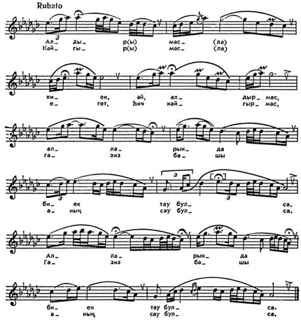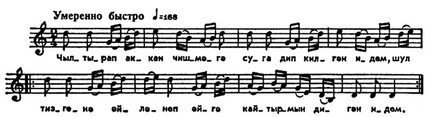 Др. разновидность — шуточные и плясовые быстрые песни (кыска кюй), для к-рых характерны чёткая мотроритмич. организация, небольшой диапазон, отсутствие орнаментики, квадратная структуpa; к ним примыкают такмаки (песни типа частушки).