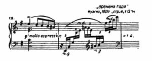 Такое же ниспадающее движение, но уже оформившееся в определенную мелодическую тему, мы встречаем в средней части «Жатвы»: