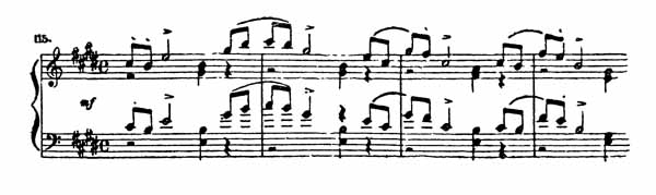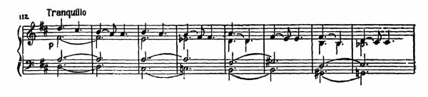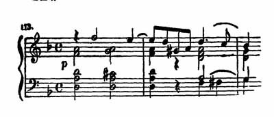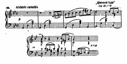 Это не законченная мелодическая тема (как неоформленная мысль), а только повторяющаяся интонация, прерываемая маленькими пассажами, подобными вспыхивающим язычкам пламени среди угольков, догорающих в камине. Сколько грустных мелодий, так же начинающихся с верхнего звука и скользящих вниз по ступеням гаммы, можно найти у Чайковского!