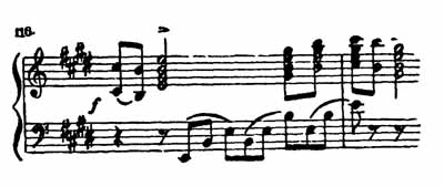Этот прием придает особую певучесть мелодии и, сохраняя прозрачность красок, в то же время подчеркивает ее выразительное значение. Во втором проведении мелодия появляется уже в сплошном аккордовом изложении, музыкальная ткань становится более плотной; это уже сочная, насыщенная звучанием «поющая гармония»: