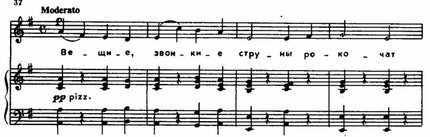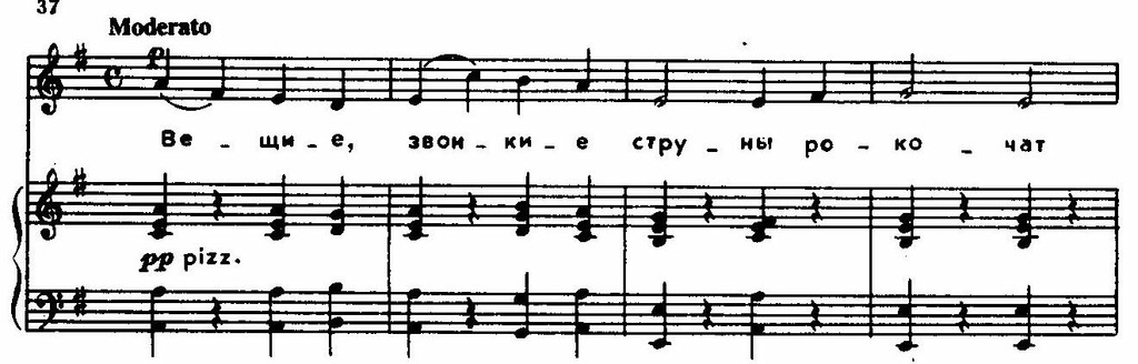 Можно назвать ряд случаев, когда композитор очень чутко улавливал ладовое своеобразие народного напева и находил удачные гармонические средства для того, чтобы его оттенить и обрисовать более выпукло. Одним из таких примеров является хор слепых гусляров «Вещие звонкие струны рокочут». Строго выдержанный натуральный минор с преобладанием плагальных оборотов хорошо соответствует торжественно-архаическому складу поэтического текста (Посылая слова песни композитору, Островский писал, что он старался в ней следовать поэтическому ритму «Слова о полку Игореве». Можно полагать, что образ вещего Бояна представлялся и мысленному взору Чайковского при сочинении музыки, в основу которой положена мелодия народной песни «Не хмель мою головушку клонит» из сборника Вильбоа, вошедшая также и в его цикл «50 русских народных песен для фортепиано в 4 руки». Последние пять тактов строфы («Долу опустим померкшие очи») присочинены композитором.). Особую таинственную окраску придает гармонизации мажорный тонический аккорд деревянных духовых в окончаниях строф.