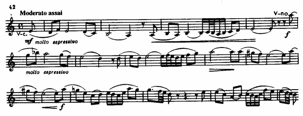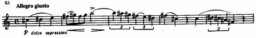 непосредственно приводящая к репризе, в которой тема главной партии мрачно, трагически звучит у скрипки sul G на фоне мерных «похоронных» аккордов фортепиано (Adagio con duolo е ben sostenuto). В кратком заключительном построении она проходит еще раз в увеличении на тоническом органном пункте, угасая и словно растворяясь к концу.